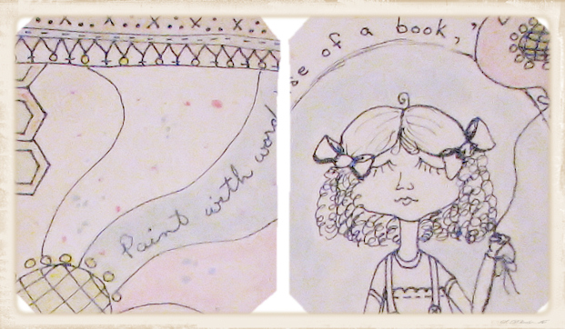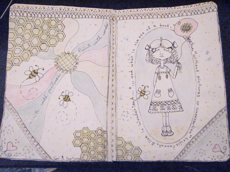 As usual, I didn’t know what I was going to do, so I started with the border at the top of the pages and let the pages develop from there. I worked in pencil and ink, until the very end when I added washes of water color and paint speckles. I was tempted to leave it black and white with no color, but settled for leaving the girl uncolored and adding pale pastels. I added no other elements to the journal this week.
