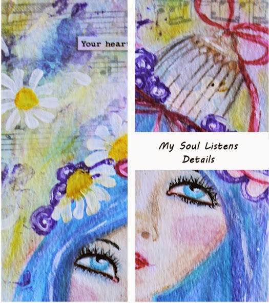 My Soul Listens – Loose journal page done with acrylics, Faber Castell Gel Sticks, stamps, collaged tissue paper on 9 x 12 mixed media paper.